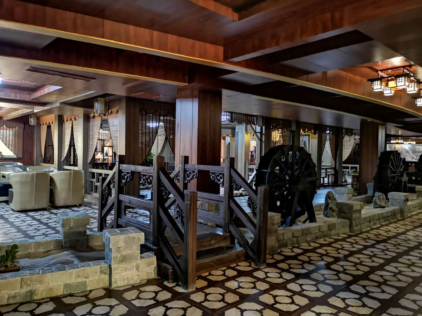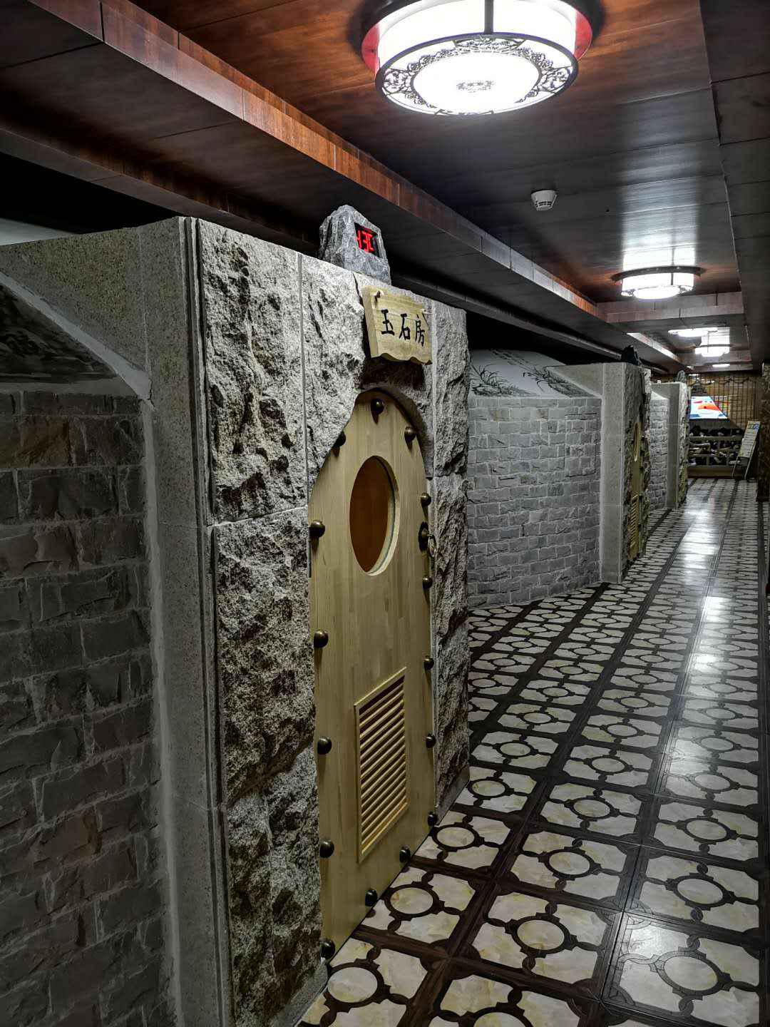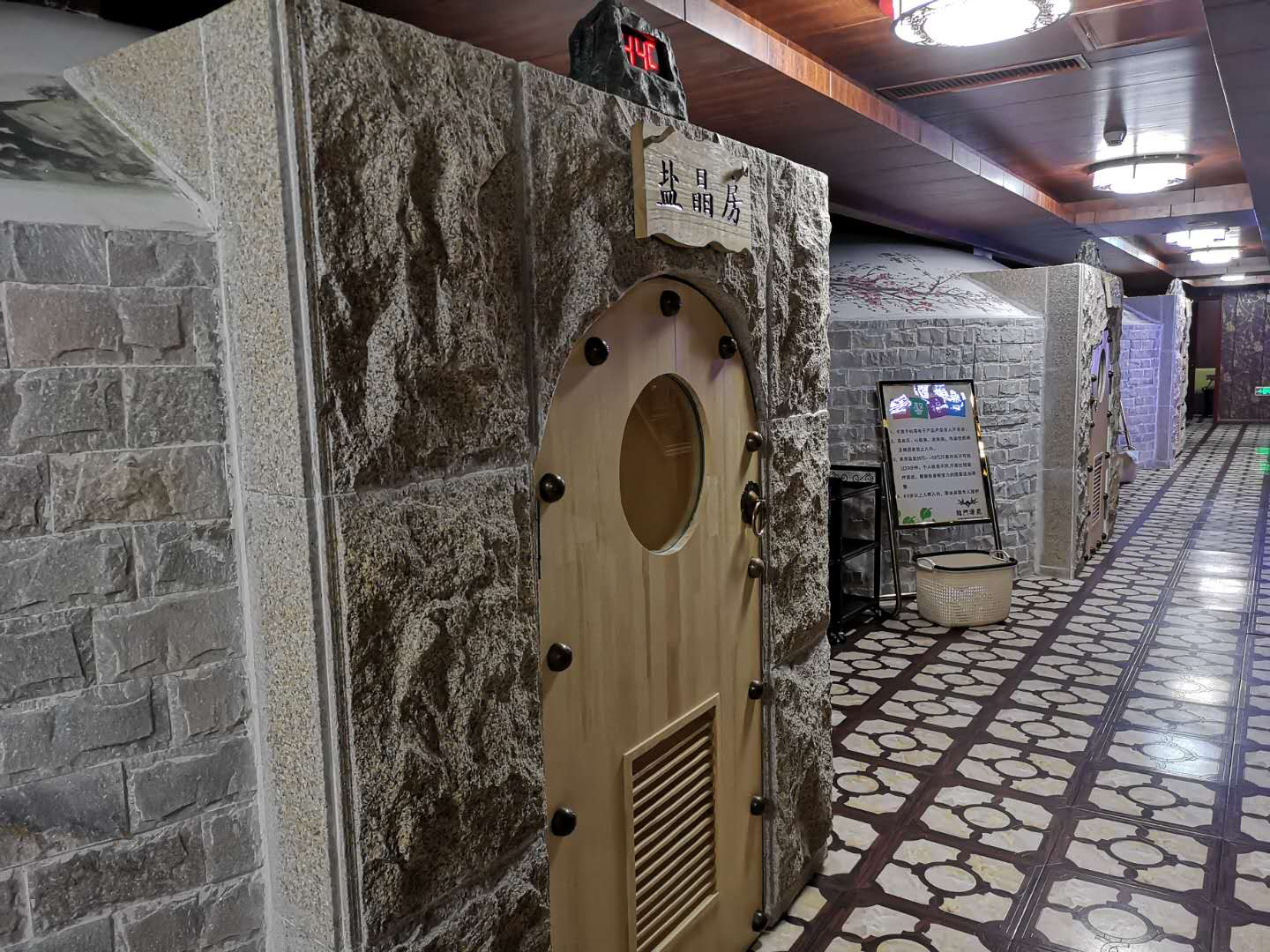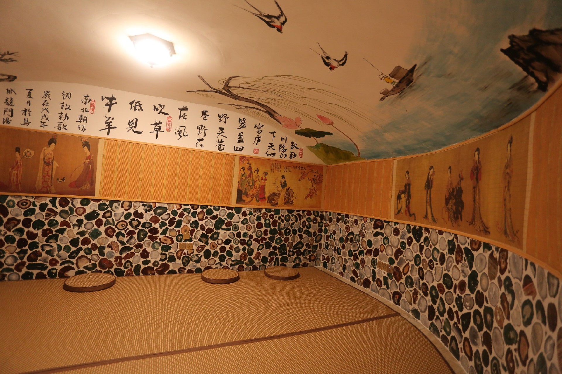 本項目施工包含四個溫泉浴池,選用國內外最先進的循環水處理系統設備,保證水質達到國家衛生安全要求,響應國家煤改電號召,配備超低溫空氣源熱泵熱水機組進行浴池加熱及恒溫,濕蒸房采用進口芬林蒸汽機制熱,二樓蒙古包汗蒸房采用專業發熱電纜制熱,添加負離子粉,麥飯石粉,采用巴基斯坦鹽磚,紅毛玉磚,玉石片,瑪瑙片等粘貼裝飾,頂部留白邀請農業大學教授采用中式繪畫及毛筆書法,營造江南水鄉,塞北草原,映日荷花,韓式風情,傲骨梅花等風情。